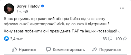 Я так розумію, що ракетний обстріл Києва під час візиту африканської миротворчої місії, це ознака її підтримки? Хочу зараз побачити очі президента ПАР та інших «товаріщєй», - написав Філатов.