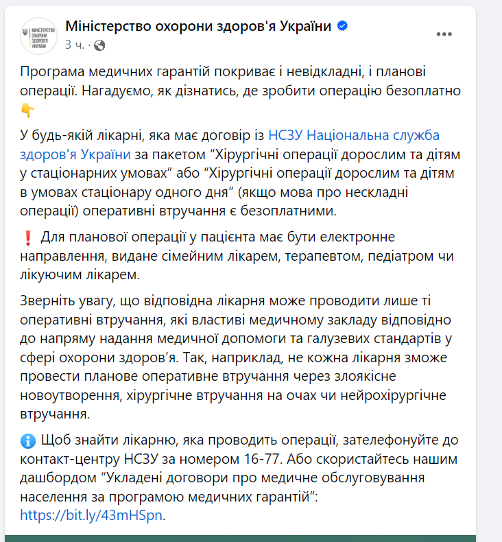 Зазначається, що у будь-якій лікарні, яка має договір із НСЗУ за пакетом “Хірургічні операції дорослим та дітям у стаціонарних умовах” або “Хірургічні операції дорослим та дітям в умовах стаціонару одного дня” (якщо йдеться про нескладні операції), оперативні втручання є безоплатними.