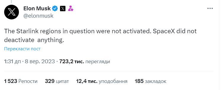 Ілон Маск заявив, що не блокував Starlink у Криму, але відмовив Україні під'єднати його для атаки на росіян.