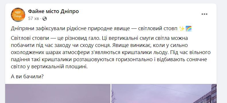 Надвечір 27 листопада, під час заходу сонця, дніпряни помітили незвичне явище. На обрії виднівся стовп світла, який тягнувся до неба. Чарівні світлини виклали у спільноті "Файне місто Дніпро".