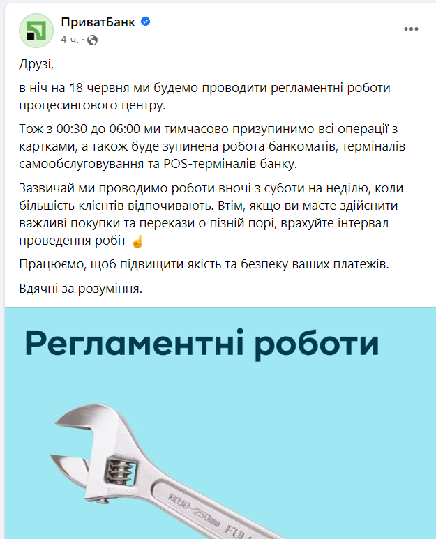 Зазвичай ми проводимо роботи вночі з суботи на неділю, коли більшість клієнтів відпочивають. Втім, якщо ви маєте здійснити важливі покупки та перекази о пізній порі, врахуйте інтервал проведення робіт, - йдеться у повідомленні.
