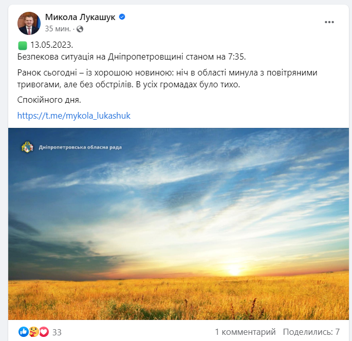 Про безпекову ситуацію в регіоні повідомив Микола Лукашук, голова Дніпропетровської обласної ради.