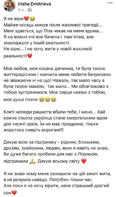 Моя любов, моя кохана дівчинка, ти була такою життєрадісною і навчила мене любити безумовно, не зважаючи ні на що! На жаль, так мало часу я була твоєю мамою, так мало... Ми обов'язково з тобою зустрінемося. Моє серце навіки з тобою, моя душа плаче", - пише вона.