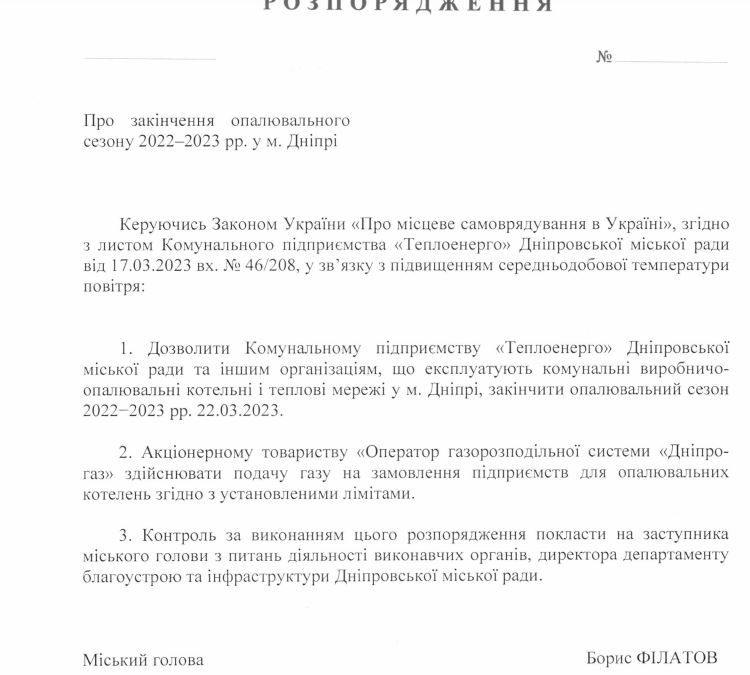Зазначається, що у зв'язку з підвищенням середньодобової температури повітря, у Дніпрі дозволили завершити опалювальний сезон. Так, він має закінчитися 22 березня.