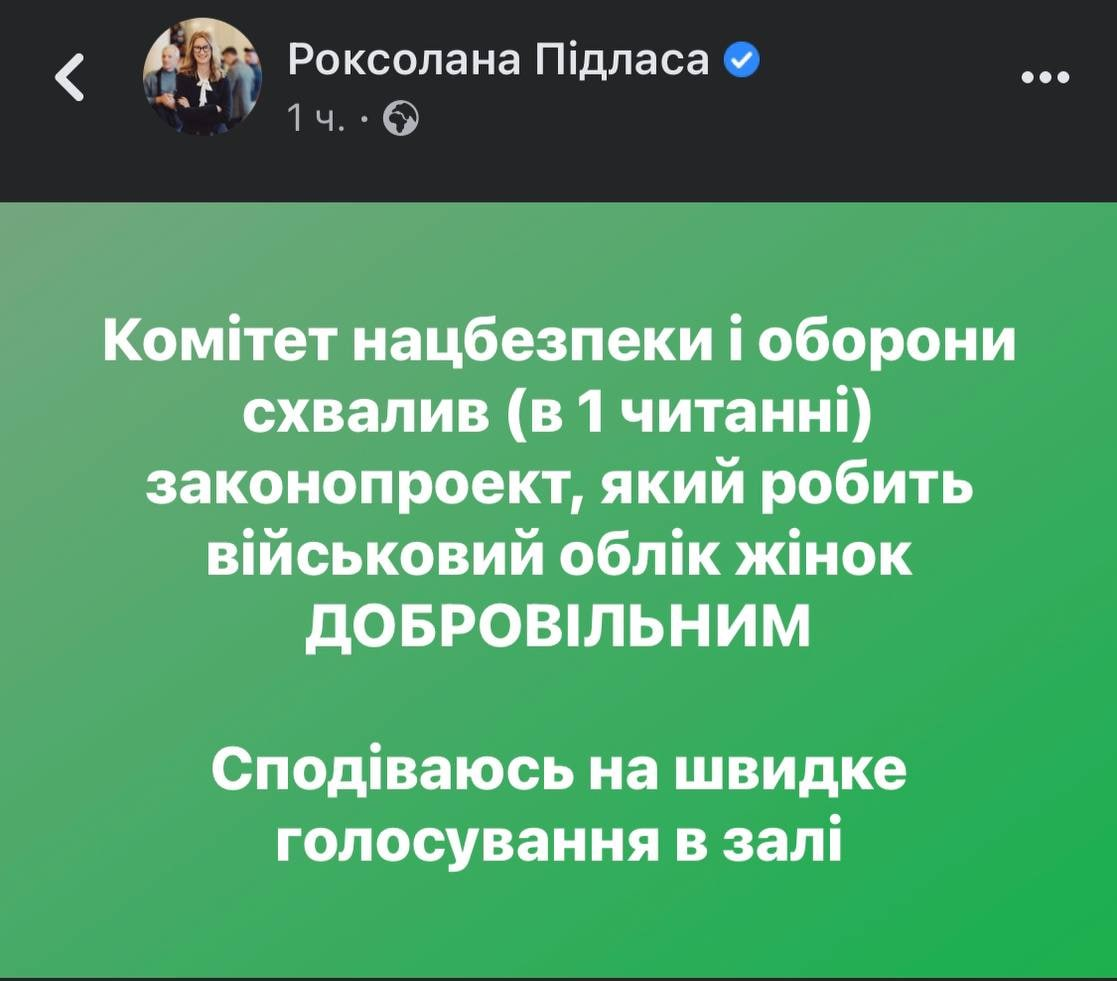 Комітет нацбезпеки і оборони схвалив (у першому читанні) законопроєкт, який робить військовий облік жінок добровільним. Сподіваюся на швидке голосування в залі, - написала нардеп.