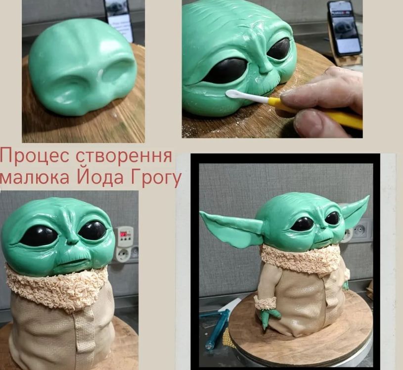 Так, Дмитро Никифоров зробив 3d торт у вигляді відомо героя фільму "Мандалорець" - малюка Йода Грогу. Він повністю їстівний та має начинку "снікерс". Вага 4,5 кілограм.