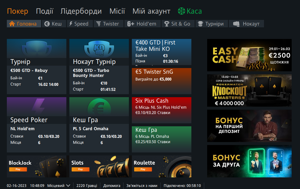 - Покер. Основний блок, в якому проходить гра. Можна обрати МТТ-турнір, кеш-стіл, лотерейні Твістери, Sit&Go, нокаут-івенти та багато чого іншого.