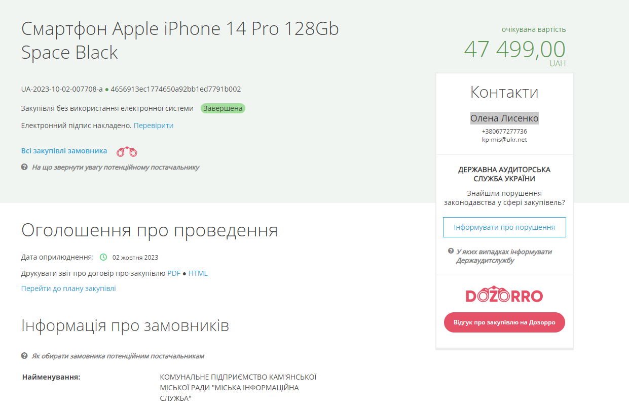 КП Кам'янської міськради придбало iPhone 14 Pro та аксесуари до нього на 50 тис. грн