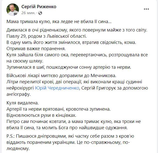 Петро сам починає ковтати, а мама тримає кулю, яка трохи не вбила її сина, та молить Бога про найшвидше одужання. Пишаюся дніпровцями, які частку себе разом з кров’ю віддають пораненим українцям. Це по-справжньому, по-людяному, - написав лікар.