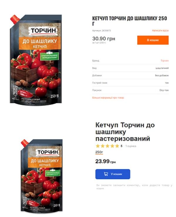 У магазині «Сільпо» упаковка кетчупу «Торчин» до шашлику коштуватиме 23,99 грн за 250 грам. У АТБ кетчупу такої фірми немає на прилавках. У Варусі за аналогічне пакування кетчупу «Торчин» просять 30,9 грн.