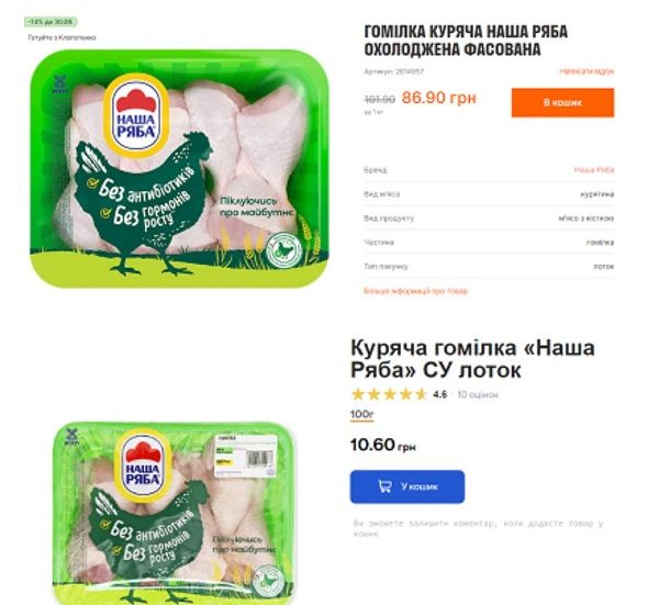 Курячі гомілки в упаковці коштуватимуть 106 грн за кіло у магазині «Сільпо». У магазині АТБ курячих гомілок такого виробника немає. У Варусі на цю позицію товару діє акційна пропозиція та купити курячі гомілки від «Нашої Ряби» в упаковці можна за ціною 86,9 грн за кіло.
