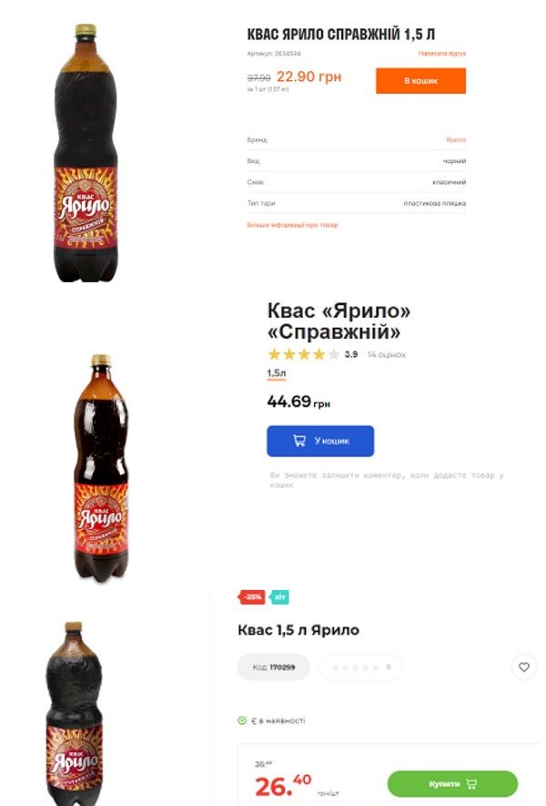 Квас «Ярило» класичний у «Сільпо» коштує 44,69 грн за півтора літри. В АТБ цей же квас продається за 26,4 грн. за аналогічний обсяг – у магазині на нього діє акційна пропозиція. У магазині Варус квас «Ярило» продають ще дешевше – по 22,9 грн. – тут також діє акційна пропозиція на цей товар.