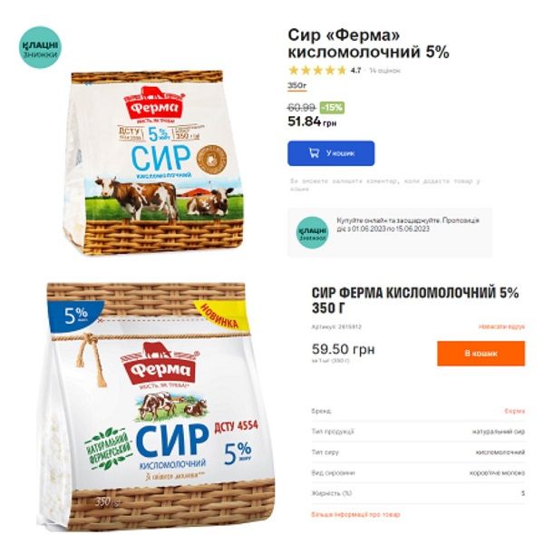 Кисломолочний сир «Ферма» 5% жирності у «Сільпо» коштує 51,8 грн. за упаковку в 350 грам. На нього у магазині діє акція. В АТБ сир «Ферма» не продається. У Варусі купити упаковку сиру «Ферма» можна за 59,5 грн.