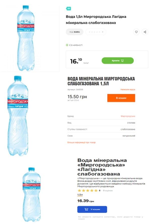 Вода «Миргородська» слабогазована у «Сільпо» коштує 16,4 грн за півтора літри. В АТБ ціна трохи менша – 16,1 грн. У Варусі півтора літри води можна придбати за ціною 15,5 грн.
