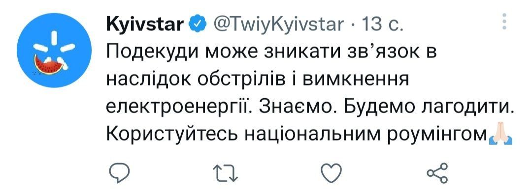 Компанія Київстар попередила про можливі перебої зі зв'язком. Через обстріли може зникати мережа. Спеціалісти знають про проблему та вирішать як тільки це буде можливо.