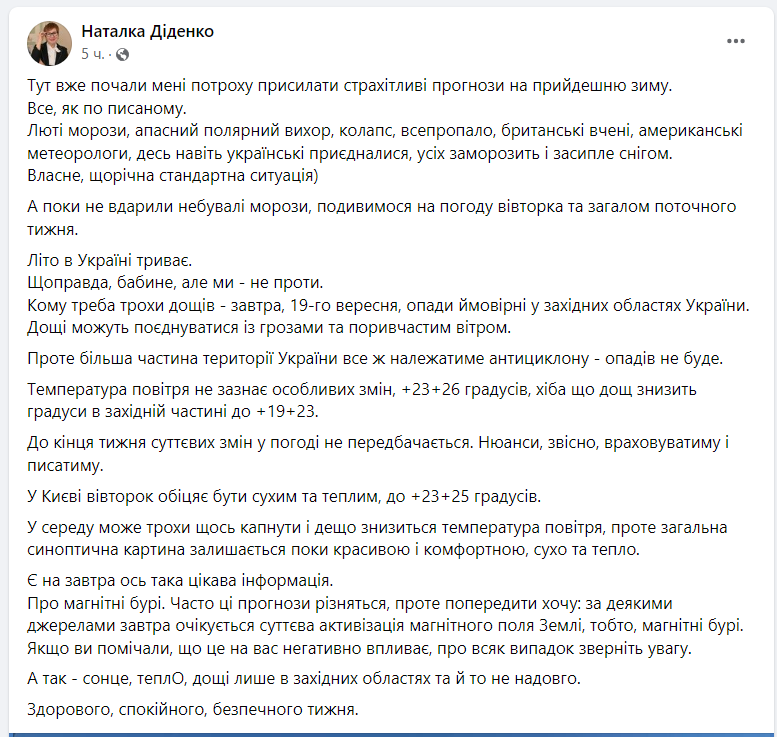 Нюанси, звісно, враховуватиму і писатиму. А так - сонце, теплО, дощі лише в західних областях, та й то не надовго, - зазначила синоптик.