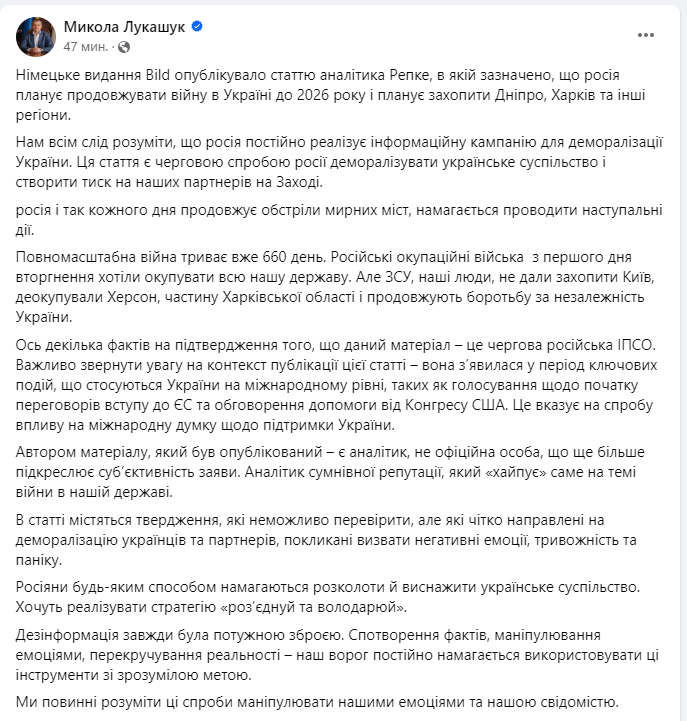 Росіяни будь-яким способом намагаються розколоти й виснажити українське суспільство. Хочуть реалізувати стратегію «розʼєднуй та володарюй». Дезінформація завжди була потужною зброєю. Спотворення фактів, маніпулювання емоціями, перекручування реальності – наш ворог постійно намагається використовувати ці інструменти зі зрозумілою метою. Ми повинні розуміти ці спроби маніпулювати нашими емоціями та нашою свідомістю. Завжди важливо пам’ятати про інформаційну гігієну та критично ставитися до будь-яких новин, особливо тих, які можуть викликати паніку чи тривогу. Тому кожного разу, коли виходить будь-яка провокаційна стаття, аналізуйте її, включайте критичне мислення та здоровий скептицизм щодо неперевірених новин, - написав Лукашук.