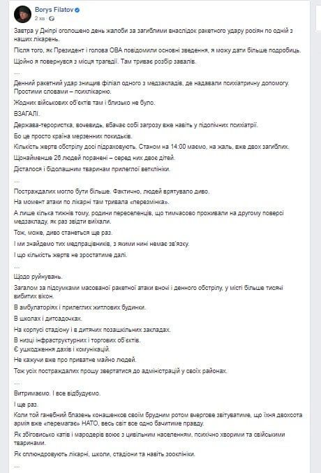 Денний ракетний удар знищив філіал одного з медзакладів, де надавали психіатричну допомогу. Простими словами – психлікарню. Жодних військових об'єктів там і близько не було. ВЗАГАЛІ. Держава-терористка, вочевидь, вбачає собі загрозу вже навіть у підопічних психіатрії. Бо це просто країна мерзенних покидьків. Кількість жертв обстрілу досі підраховують. Дісталося і бідолашним тваринам прилеглої ветклініки, - написав мер Дніпра.