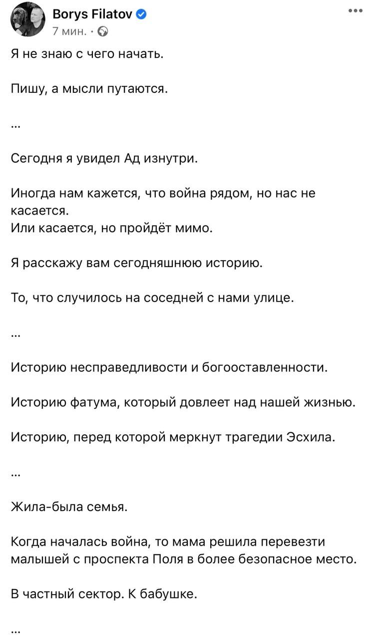 За його словами, вибух був таким сильним, що люди буквально випарувалися. Рятувальники знаходили не тіла, а фрагменти людських тіл. Відомо, що у зруйнованому будинку жила сім'я, яка переїхала до бабусі у приватний сектор на час війни. Родина сподівалася, що там буде безпечніше, аніж у квартирі на Поля.