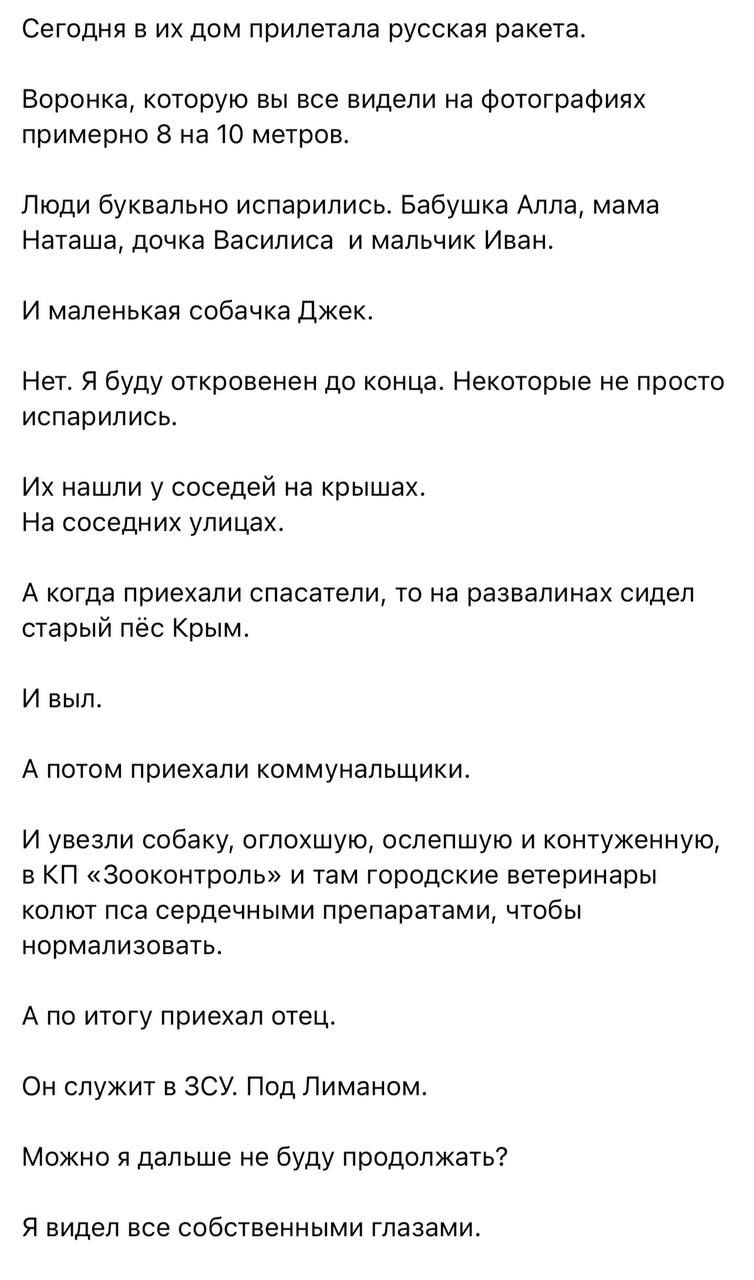 На руїнах сидів пес Крим, який вижив під час удару. Ним зараз займаються у КП «Зооконтроль», собака контужена і має проблеми з серцем. Як розповів Філатов, на місце удару приїхав батько маленьких Василиси та Івана. Чоловік служить під Лиманом, і сьогодні втратив всю свою родину.