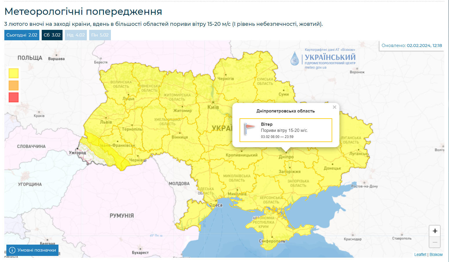 У суботу, 3 лютого, у Дніпрі та області погіршиться погода - на регіон мчить штормовий вітер. Пориви сягатимуть 15-20 метрів за секунду. Це жовтий рівень небезпеки.
