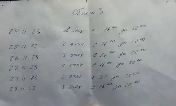 Вони надіслали графік відключень світла. Світло вимикають на 5 годин ввечері раз на три дні. У кожного поверху - свій графік. Але іноді його не дотримуються і електроенергії немає більше 12 годин.