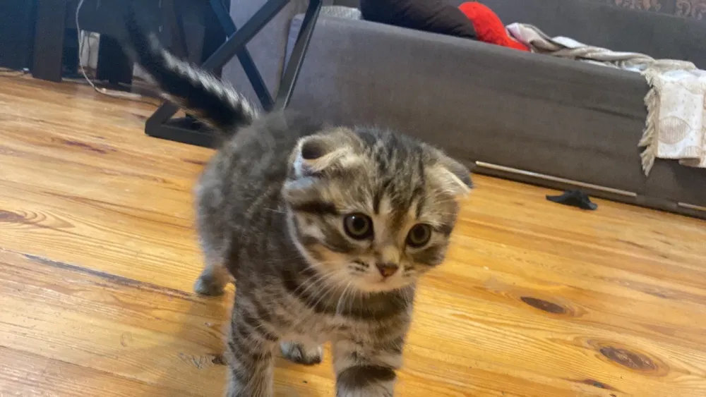 Маленька шотландська висловуха киця шукає свою родину.