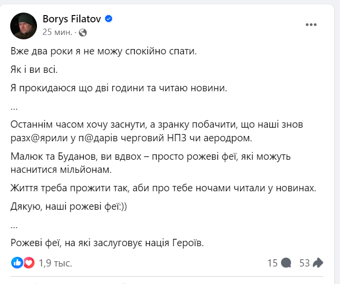 Уже два роки я не можу спокійно спати. Як і ви всі. Я прокидаюся що дві години та читаю новини. Останнім часом хочу заснути, а зранку побачити, що наші знов разх@ярили у п@дарів черговий НПЗ чи аеродром. Малюк та Буданов, ви вдвох – просто рожеві феї, які можуть наснитися мільйонам. Життя треба прожити так, аби про тебе ночами читали у новинах. Дякую, наші рожеві феї:)) Рожеві феї, на яких заслуговує нація Героїв, - написав Філатов.