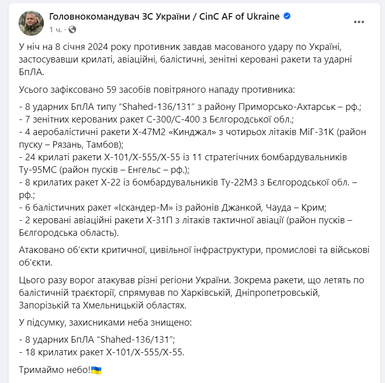 Уночі та вранці 8 січня росіяни масовано атакували Україну, застосувавши крилаті, авіаційні, балістичні, зенітні керовані ракети та ударні БпЛА.