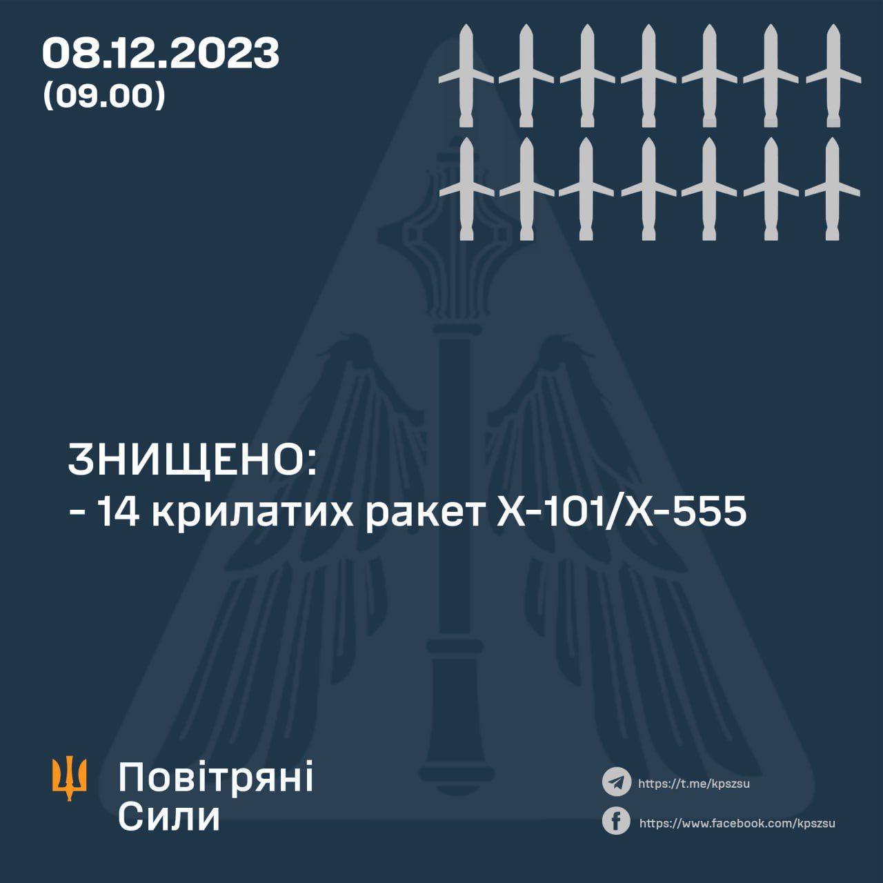 Станом на 09:00 знищено 14 із 19 крилатих ракет Х-101/Х-555 на Дніпропетровщині та Київщині.