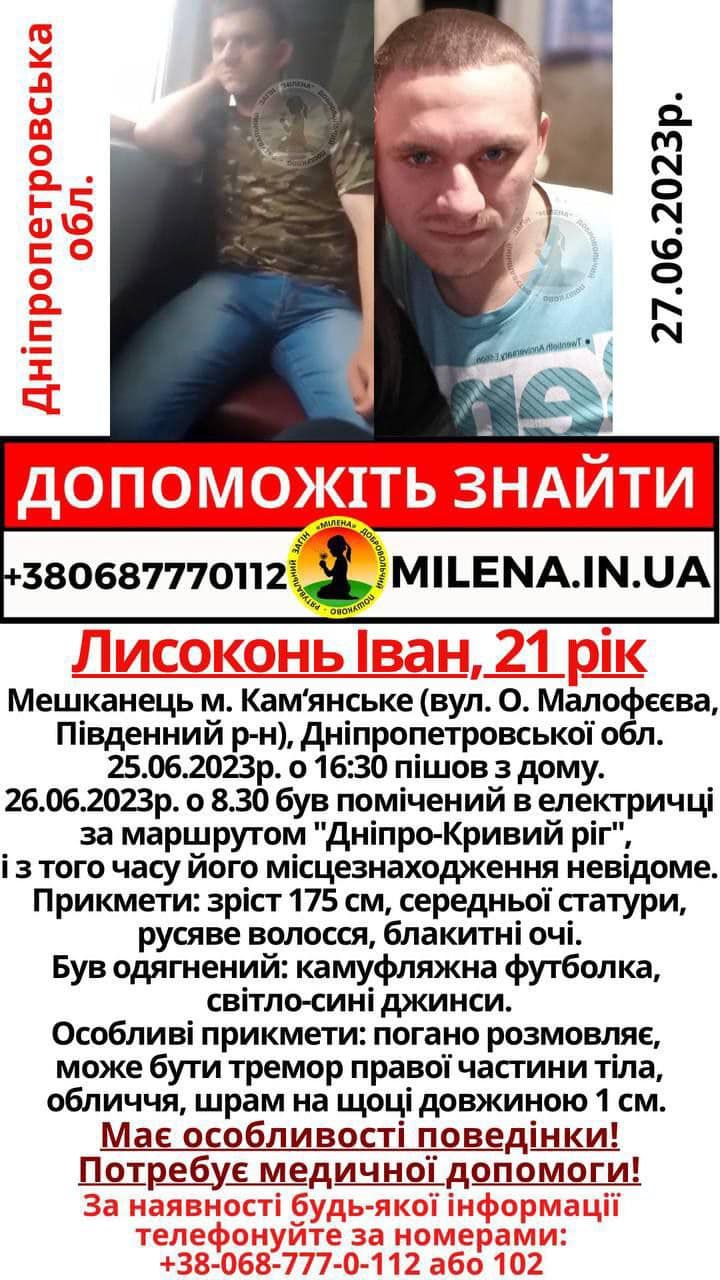 У Дніпропетровській області розшукують 21-річного Івана Лисоконя.