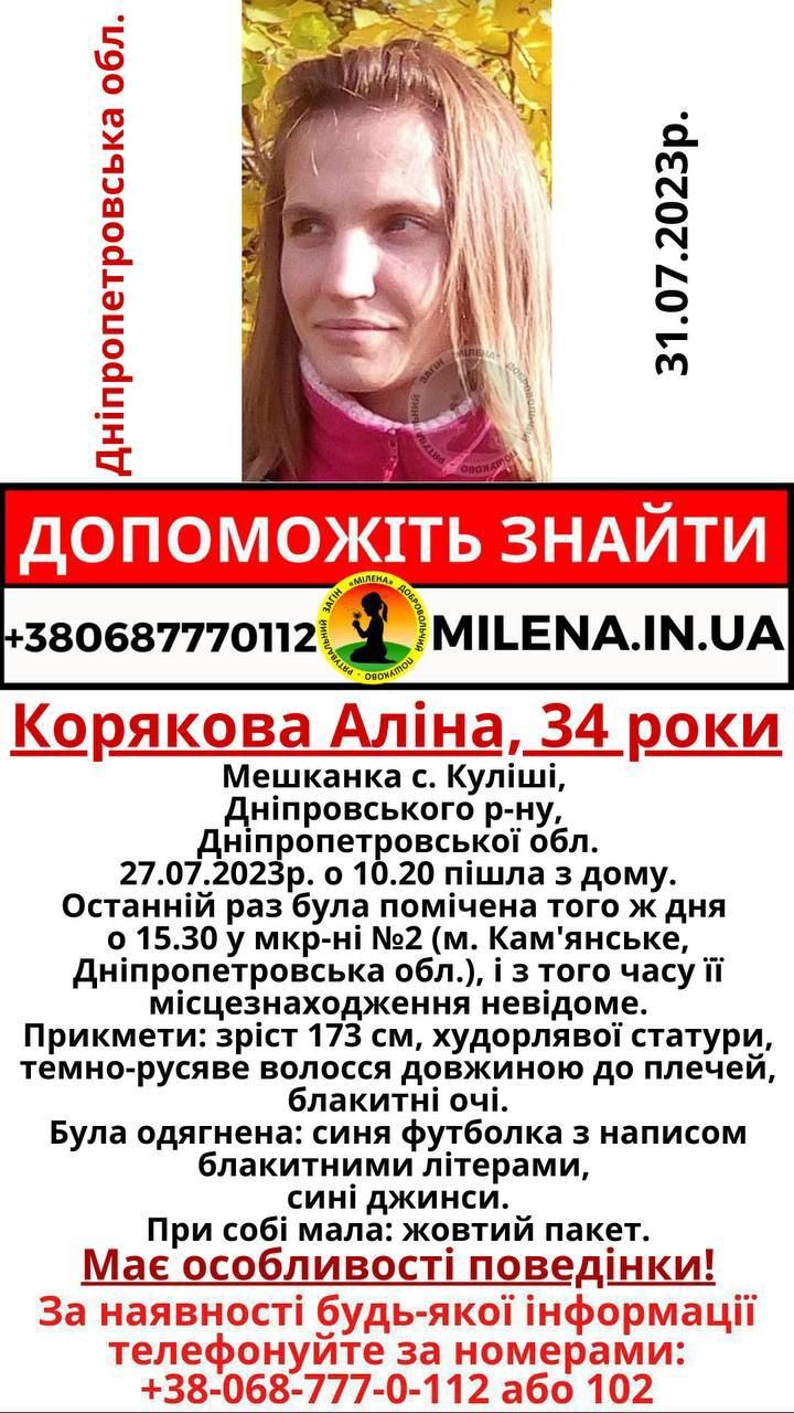 34-річна Аліна Корякова зникла 4 дні тому. Жінка зранку 27 липня вийшла з дому в селищі Куліші, Дніпровського р-ну. Востаннє її бачили у мікрорайоні №2 в місті Кам'янського.