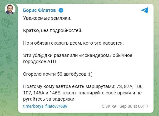 Міський голова Дніпра Борис Філатов повідомив, що внаслідок ракетного удару зруйноване міське авто-транспортне підприємство. Згоріло 50 автобусів, містян попереджають про тимчасові незручності. На низці маршрутів буде скорочено кількість маршруток, тому виходьте у справах заздалегідь.