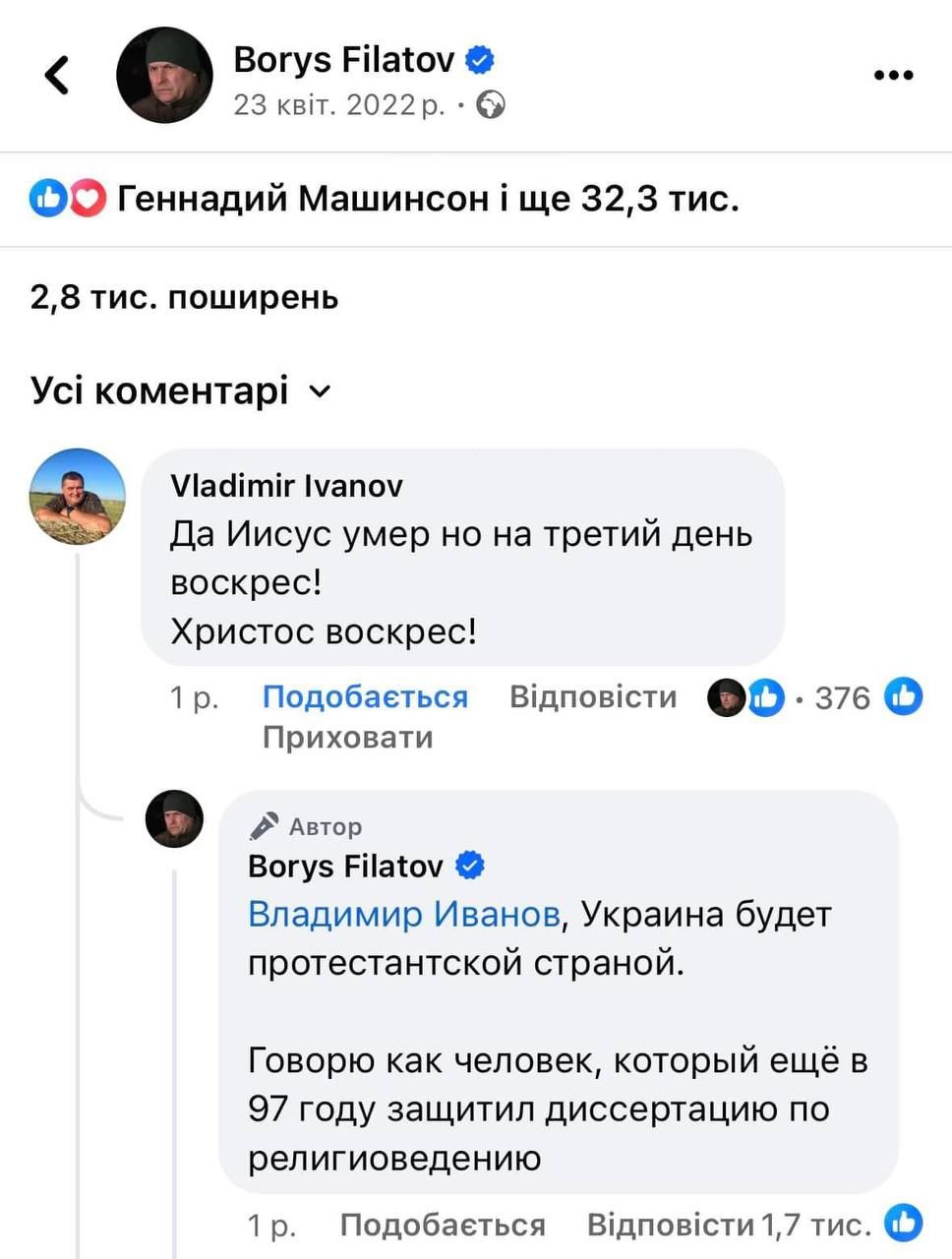Також Борис Філатов додав, що слова Папи - це продовження майже двохтисячолітньої дискусії, що почалася ще за часів Доната Карфагенського. Це відповідь на одвічне запитання: "Чи є святість у тих, хто йде на угоду з дияволом?".