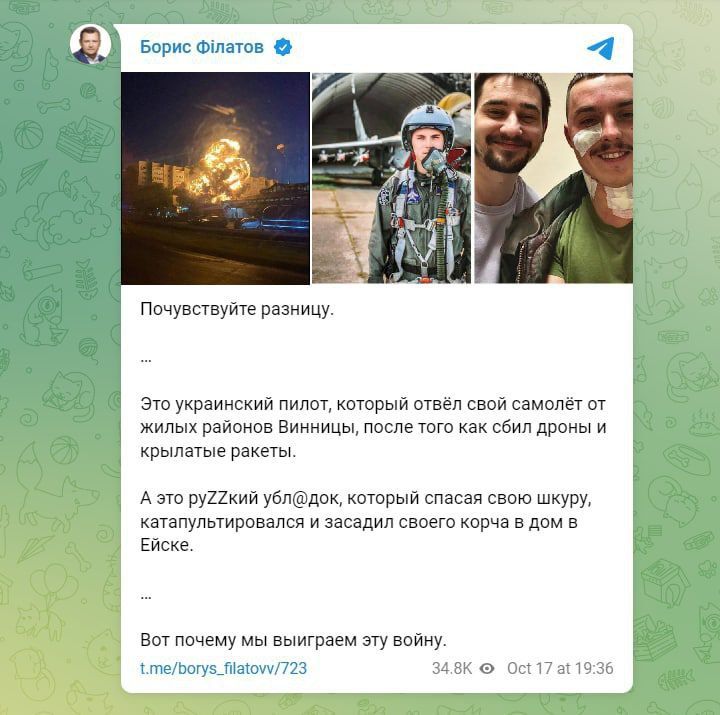 “Це український пілот, який вивів свій літак з житлових районів міста Вінниця після того, як збив дрони та крилаті ракети. А це російська сволота, яка, рятуючи свою шкуру, катапультувалася і посадила свою колимагу на хату в Єйську.…Ось чому ми виграємо цю війну”, – написав мер.