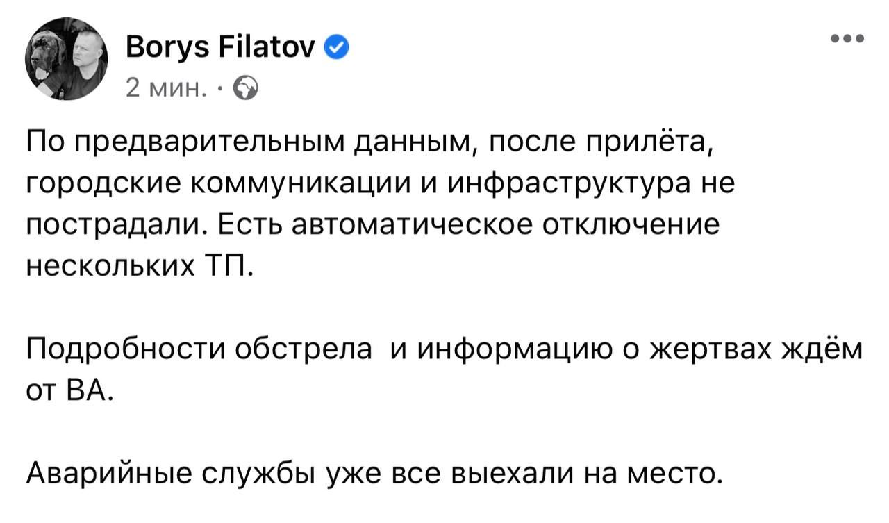 За попередніми даними, після прильоту міські комунікації та інфраструктура не постраждали. Є автоматичне вимкнення кількох ТП. Подробиці обстрілу та інформацію про жертв чекаємо від ВА. Аварійні служби вже усі виїхали на місце, - написав Борис Філатов.