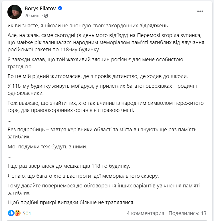 Саме сьогодні (в день мого відʼїзду) на Перемозі згоріла зупинка, що майже рік залишалася народним меморіалом памʼяті загиблих від влучання російської ракети по 118-му будинку. Я завжди казав, що той жахливий злочин росіян є для мене особистою трагедією. Бо це мій рідний житломасив, де я провів дитинство, де ходив до школи. У 118-му будинку живуть мої друзі, у прилеглих багатоповерхівках – родичі і однокласники. Тож вважаю, що знайти тих, хто так вчинив із народним символом пережитого горя, для правоохоронних органів є справою честі, - написав мер.