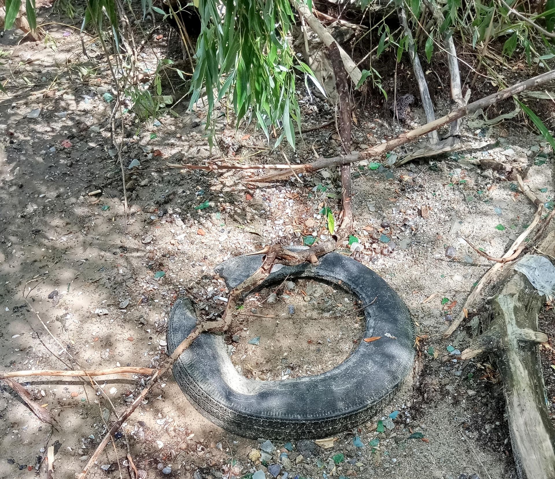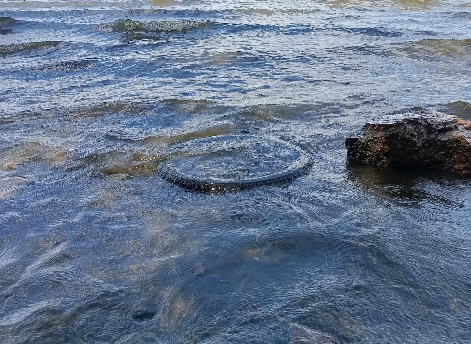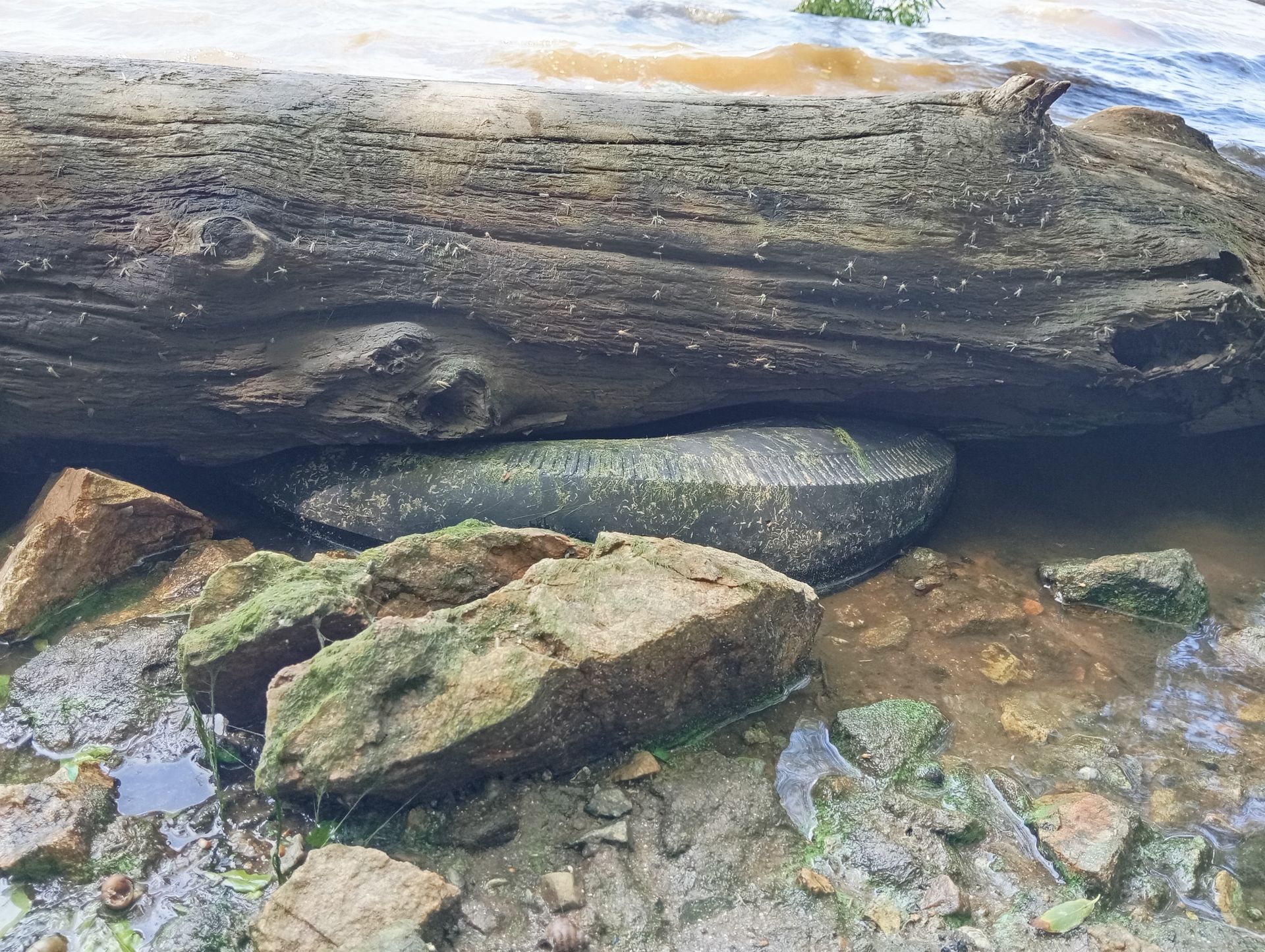 На березі знаходилась велика кількість шин. Як вони туди потрапили - невідомо. Виявилося навіть, що дуже довгий час дерево, яке начебто "лежало" на воді, підпирала одна з них.