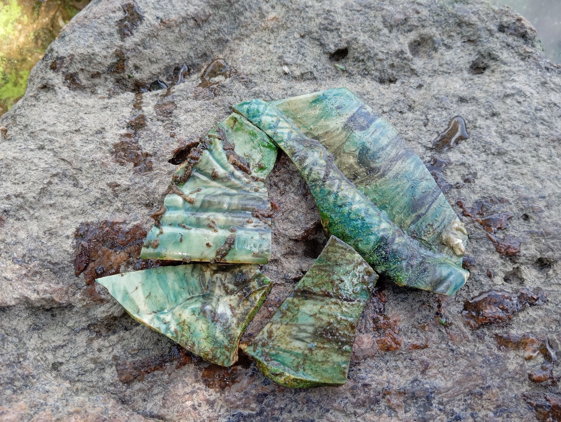 Глиняні уламки якогось посуду з незвичайним візерунком. Цікаво, скільки вони пролежали на дні річки?