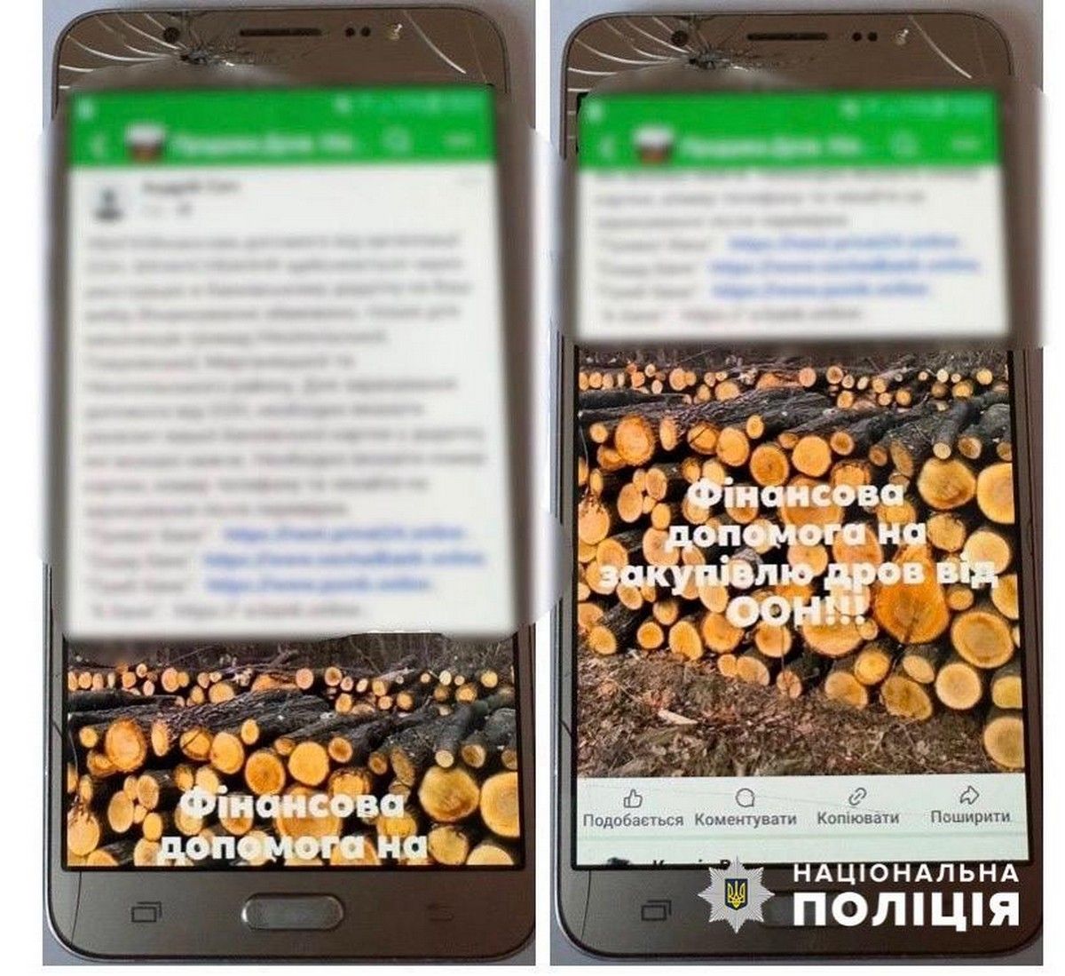 Крім того, за допомогою фішингового посилання зловмисник опублікував оголошення про надання соціальної допомоги на закупівлю дров. На гачок зловмисника потрапив один із мешканців Нікополя. З банківської карти потерпілого було списано всі гроші.