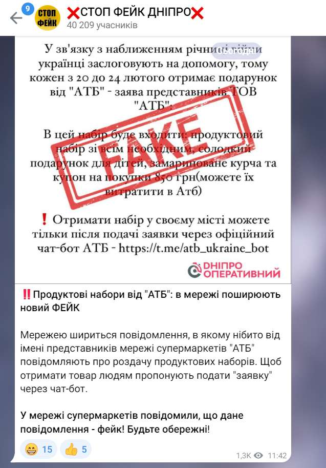 Днями у мережі почали поширювати інформацію нібито від імені представників супермаркетів "АТБ". У ній йдеться про роздачу продуктових наборів.