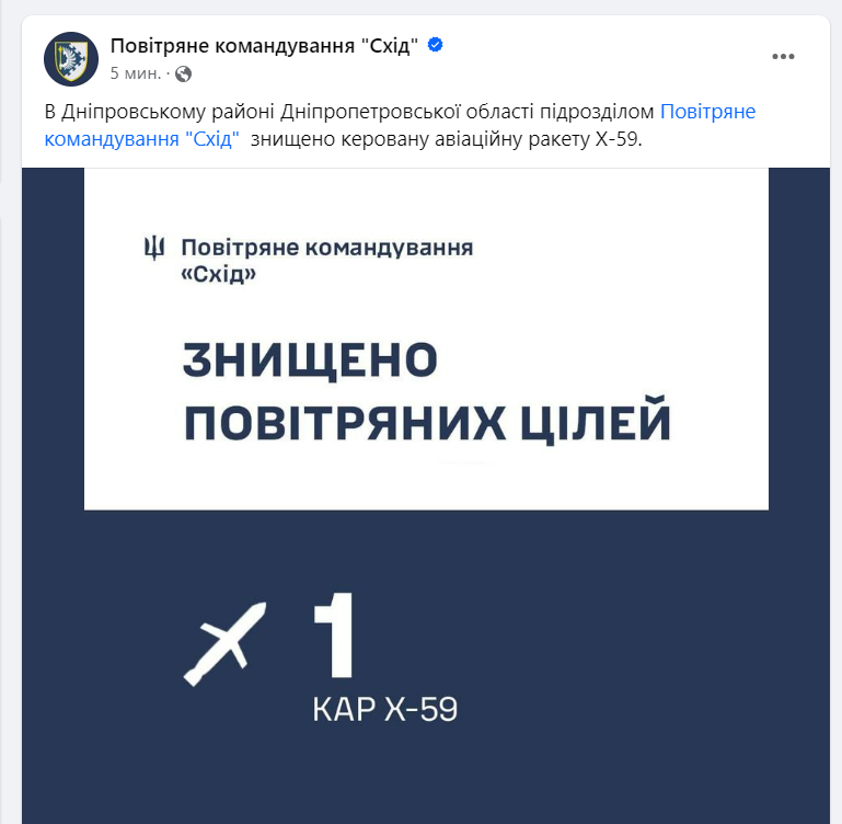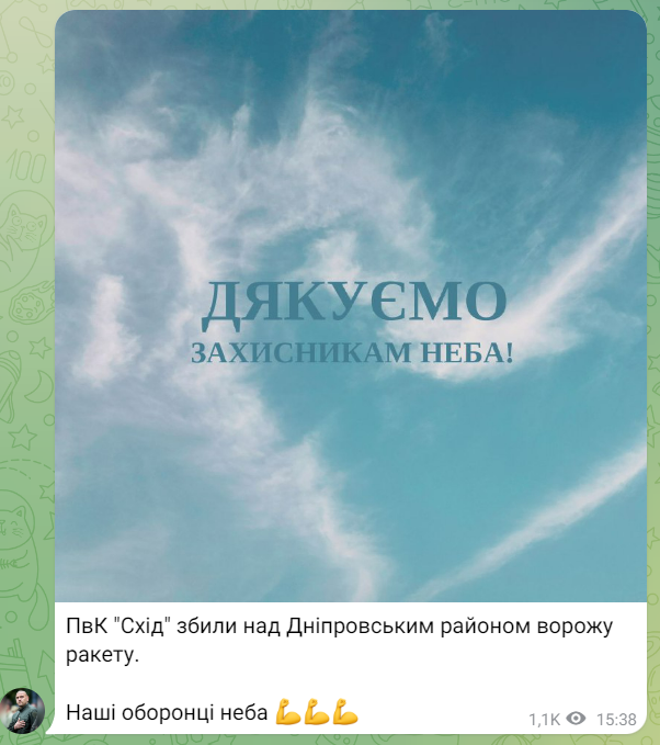 ПвК "Схід" збили над Дніпровським районом ворожу ракету. Наші оборонці неба - сила, - написав він.