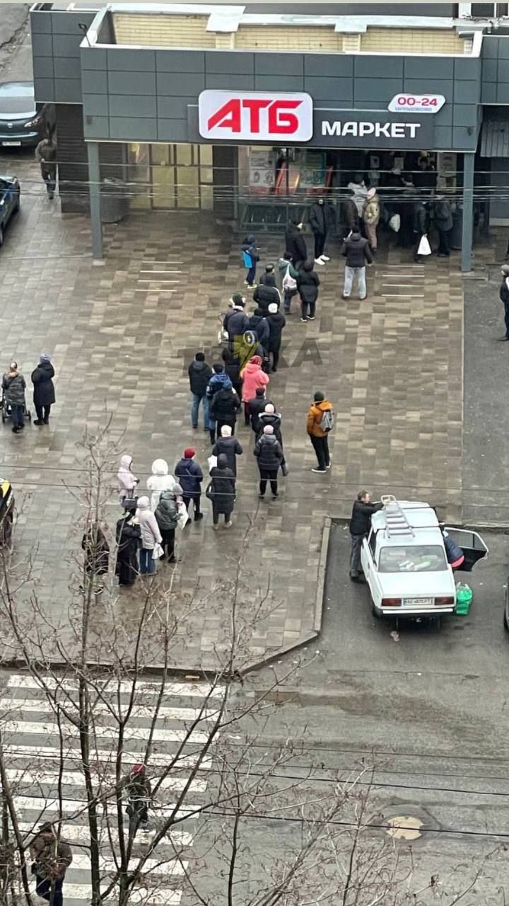 Уже другий день Дніпро живе в умовах блекауту. Збираються черги біля бюветів та магазинів. Місцеві мешканці публікують фото довжелезних черг до супермаркету АТБ.