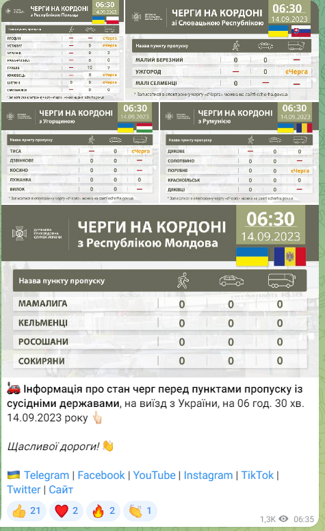 Зазначається, що кожні 3 години, з 6:30 до 21:30, буде з'являтися інформація щодо актуального стану черг у пунктах пропуску на західному кордоні з Польщею, Угорщиною, Румунією, Словаччиною та Молдовою.