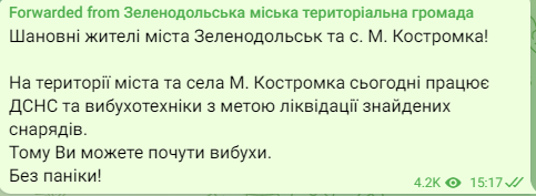 На території міста Зеленодольськ та села Мала Костромка сьогодні працюють ДСНС та вибухотехніки з метою ліквідації знайдених снарядів. Тому ви можете почути вибухи. Без паніки, - йдеться в повідомленні.