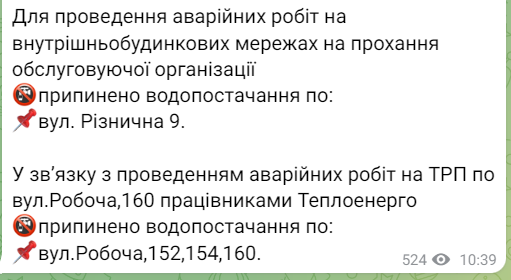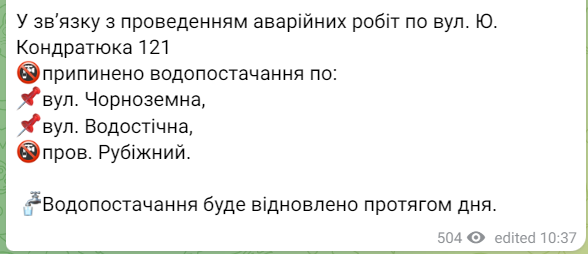 Крім того, припинено водопостачання: