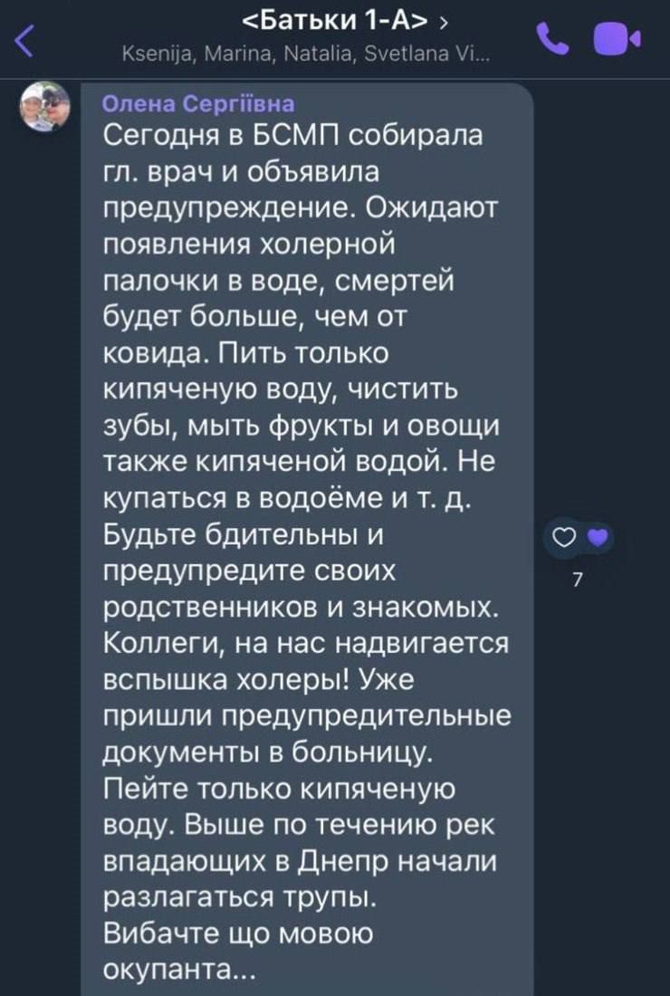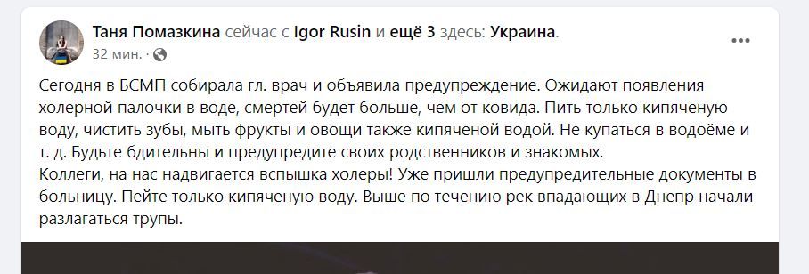 У тексті повідомлення мовиться про те, що якась невідома лікарка попереджає про холерну паличку та закликає мити овочі в кип'яченій воді та не користуватися водою з-під крана. Причина дуже дивна. За словами неназваного "джерела" вище за течією рік, які впадають в Дніпро, ніби-то купа трупів, які розкладаються.