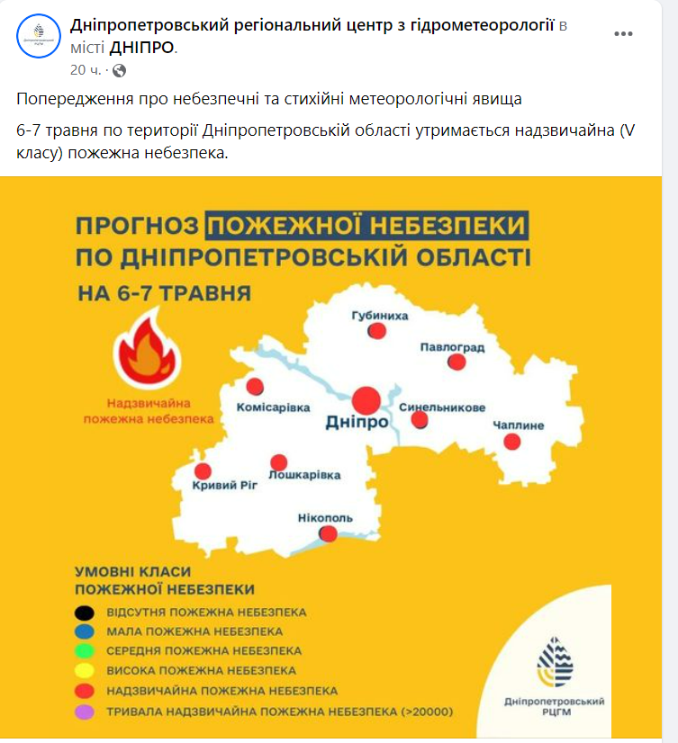 Синоптики Дніпропетровського регіонального центру з гідрометеорології попередили мешканців Дніпра та області про небезпечне та стихійне метеорологічне явище: 6-7 травня на території Дніпропетровській області утримається надзвичайна (V класу) пожежна небезпека.