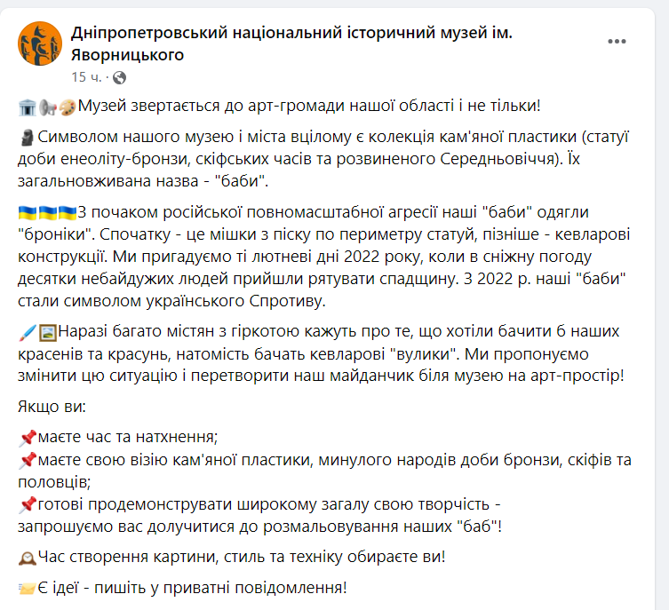 Ми пригадуємо ті лютневі дні 2022 року, коли в сніжну погоду десятки небайдужих людей прийшли рятувати спадщину. З 2022 р. наші "баби" стали символом українського Спротиву. Наразі багато містян з гіркотою кажуть про те, що хотіли бачити б наших красенів та красунь, натомість бачать кевларові "вулики". Ми пропонуємо змінити цю ситуацію і перетворити наш майданчик біля музею на арт-простір! - йдеться у повідомленні.