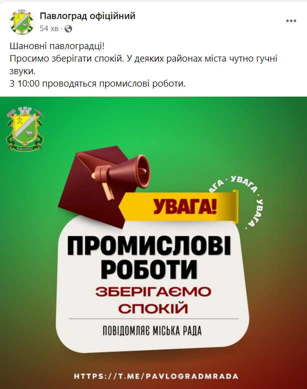 Шановні павлоградці! Просимо зберігати спокій. У деяких районах міста чутно гучні звуки. З 10:00 проводяться промислові роботи, - йдеться у повідомленні.